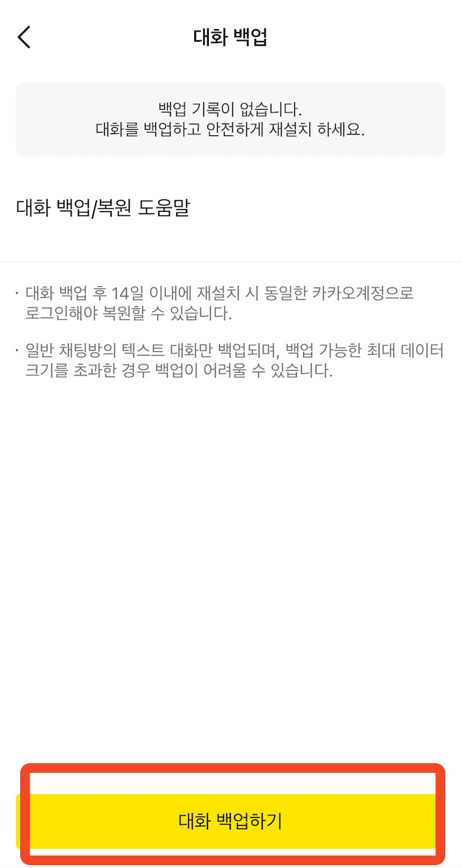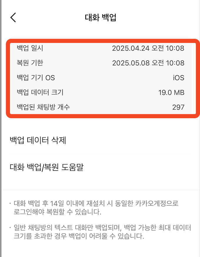 - 카카오톡 앱 실행 → [설정] → [채팅] → [대화 백업] → 마지막 백업 일시 확인