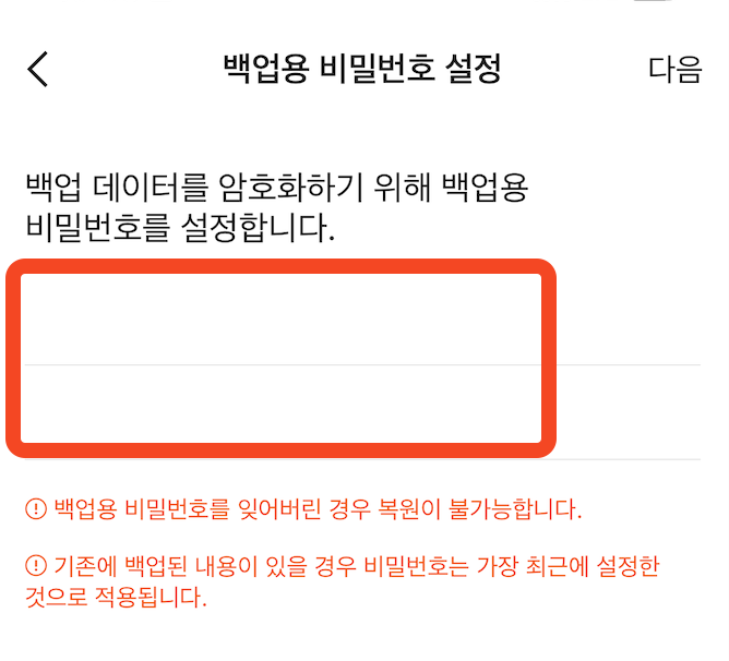 백업 비밀번호는 복원 시 필요하므로 꼭 기억해두세요. 잊으면 복원이 불가능합니다.