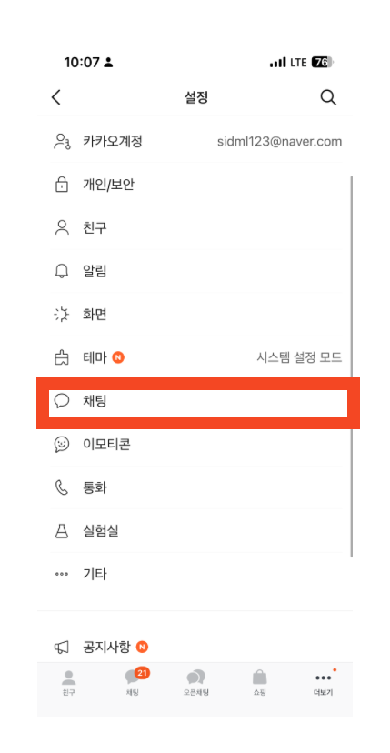 - 카카오톡 앱 실행 → 우측 하단 [더보기 (...)] → 설정