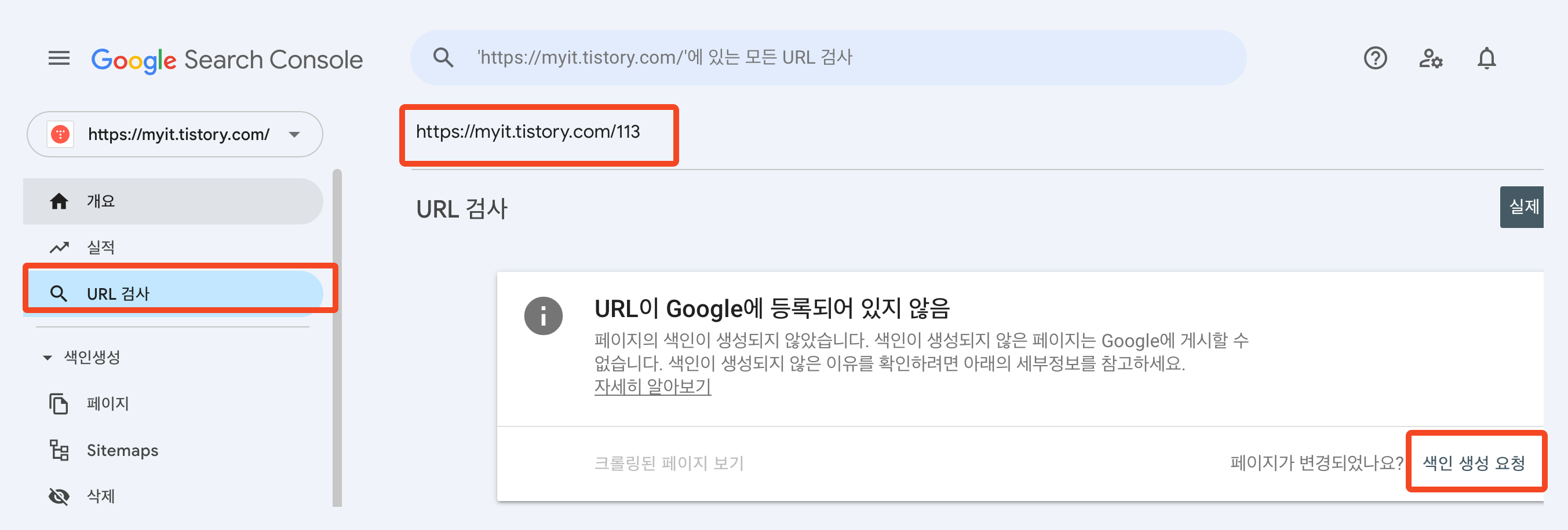 - 구글 서치콘솔 검색 후 접속 > URL 검사 도구에 해당 포스트 URL 입력