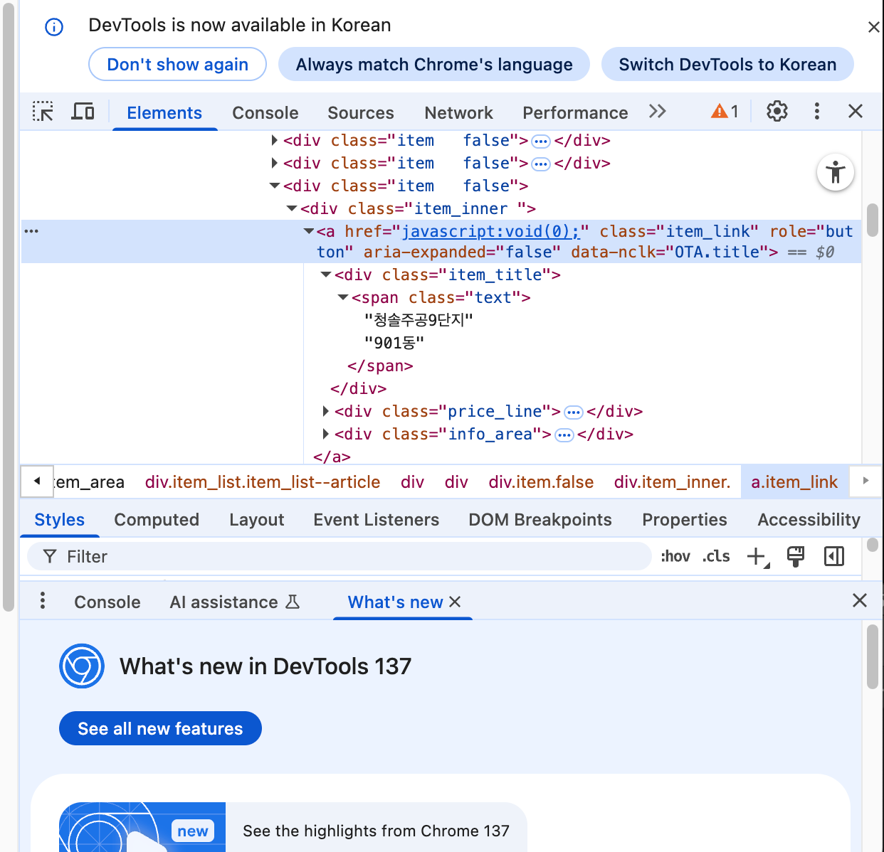 print(f"총 {len(items)}개의 매물 블록 발견.")