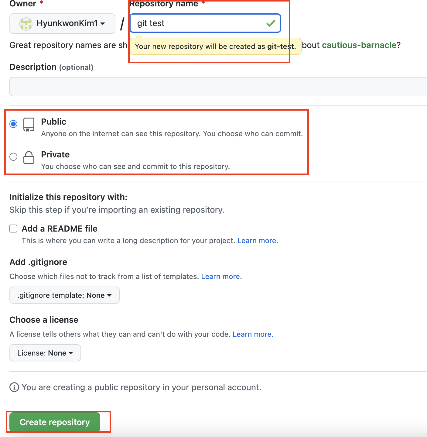 Repository 이름, public, private 공개로 만들것인지 비공개로 만들것인지 설정후 아래 Create repository 버튼을 눌러주세요.