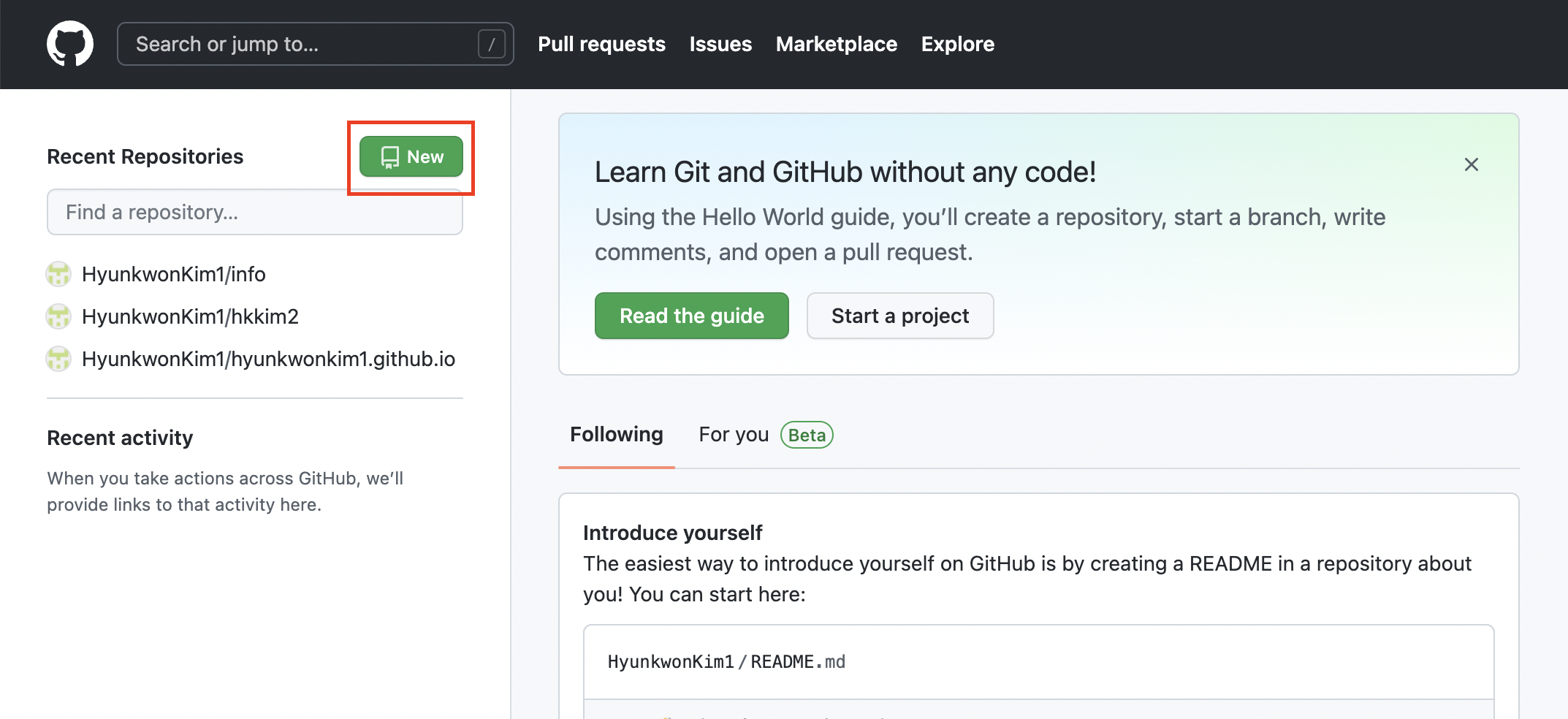 로그인 후 좌측에 "NEW" 버튼 또는 "Create repository" 을 클릭해주세요.