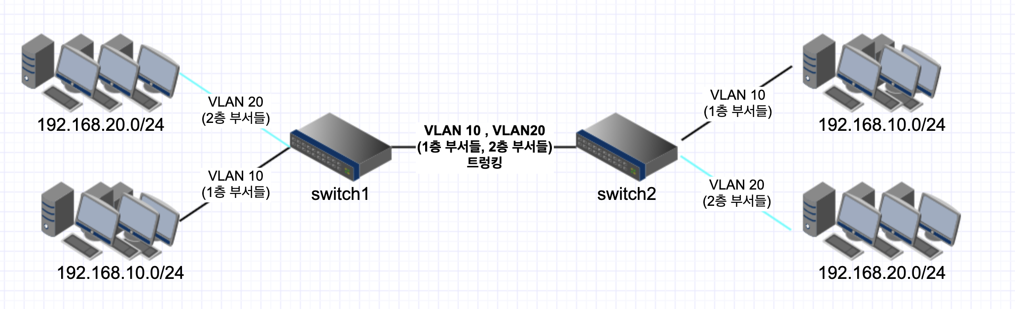 참고로 트렁크 포트를 하여도 VLAN 10번과 20번 사이는 통신되지 않으며 이해를 돕기위해 사진 첨부하였습니다.