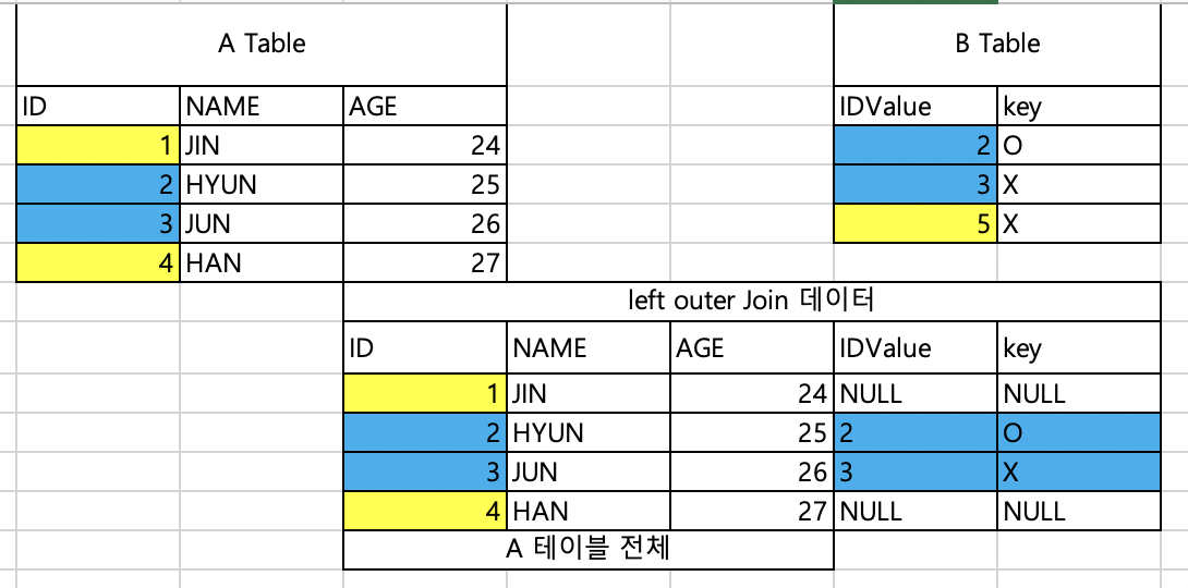 - OUTER JOIN(외부 조인) : 한개의 테이블만 존재해도 데이터가 나온다.