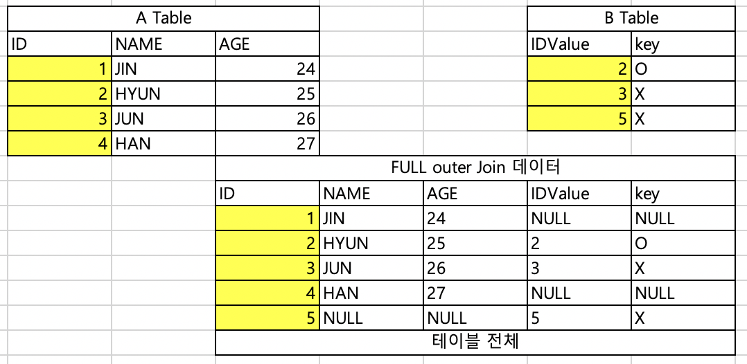 두 테이블의 모든 것들을 가져옴 (조건에 해당하지 않는 것들은 NULL 값 도출)