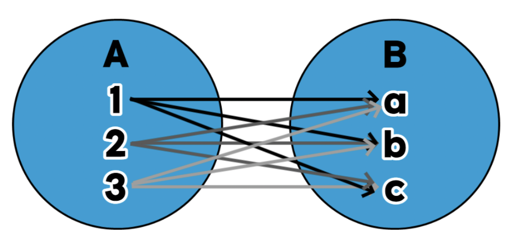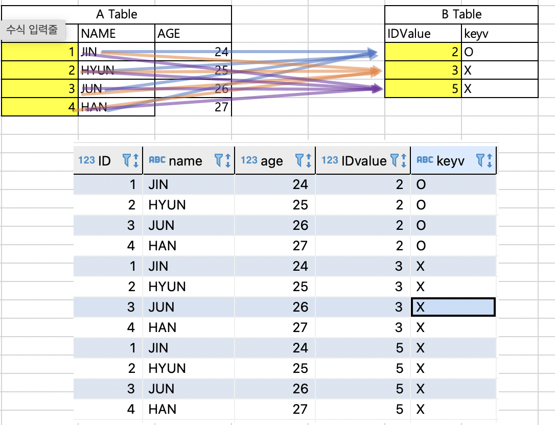 A 행 개수 * B 행 개수 모든 행에 대하여 곱한 값의 데이터가 나옵니다.