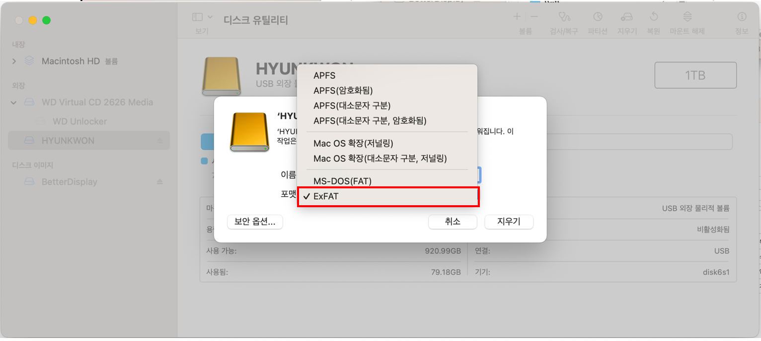 4. 포맷형식 설정 및 외장하드 이름 설정 후 지우기 버튼 클릭합니다.