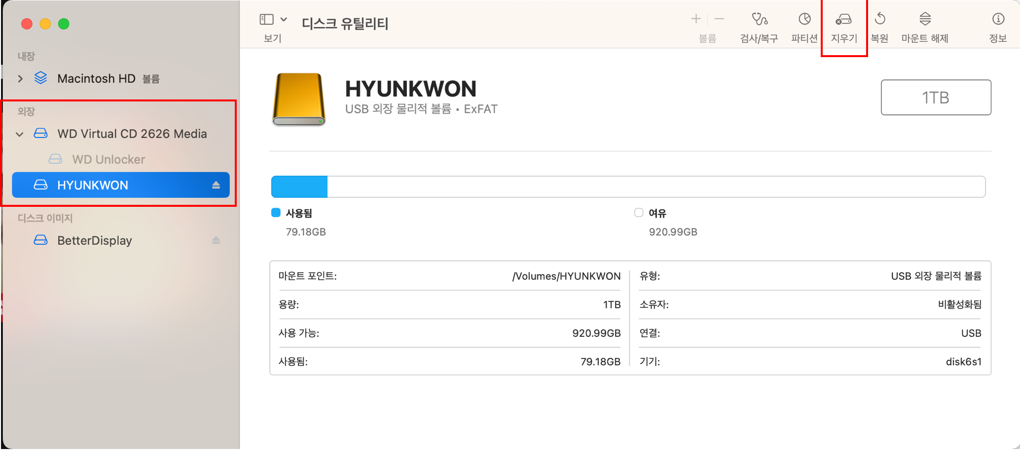 3. 초기화 할 외장하드를 클릭하고 우측 상단에 지우기 버튼 클릭